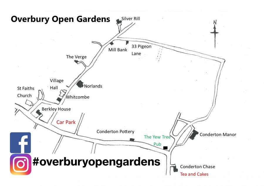 Free parking is available in the field at the bottom of Overbury and most of the gardens are within a short stroll of each other. A map is attached so you can plan your route.